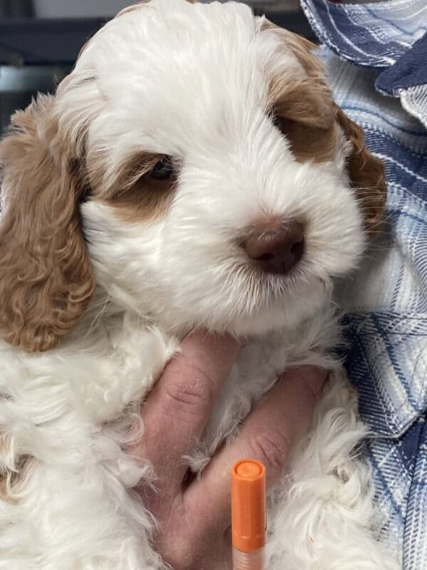 This little parti girl, Sophie, will be part of our breeding group while she lives with her new family. Watch for her in a bout 2 years.